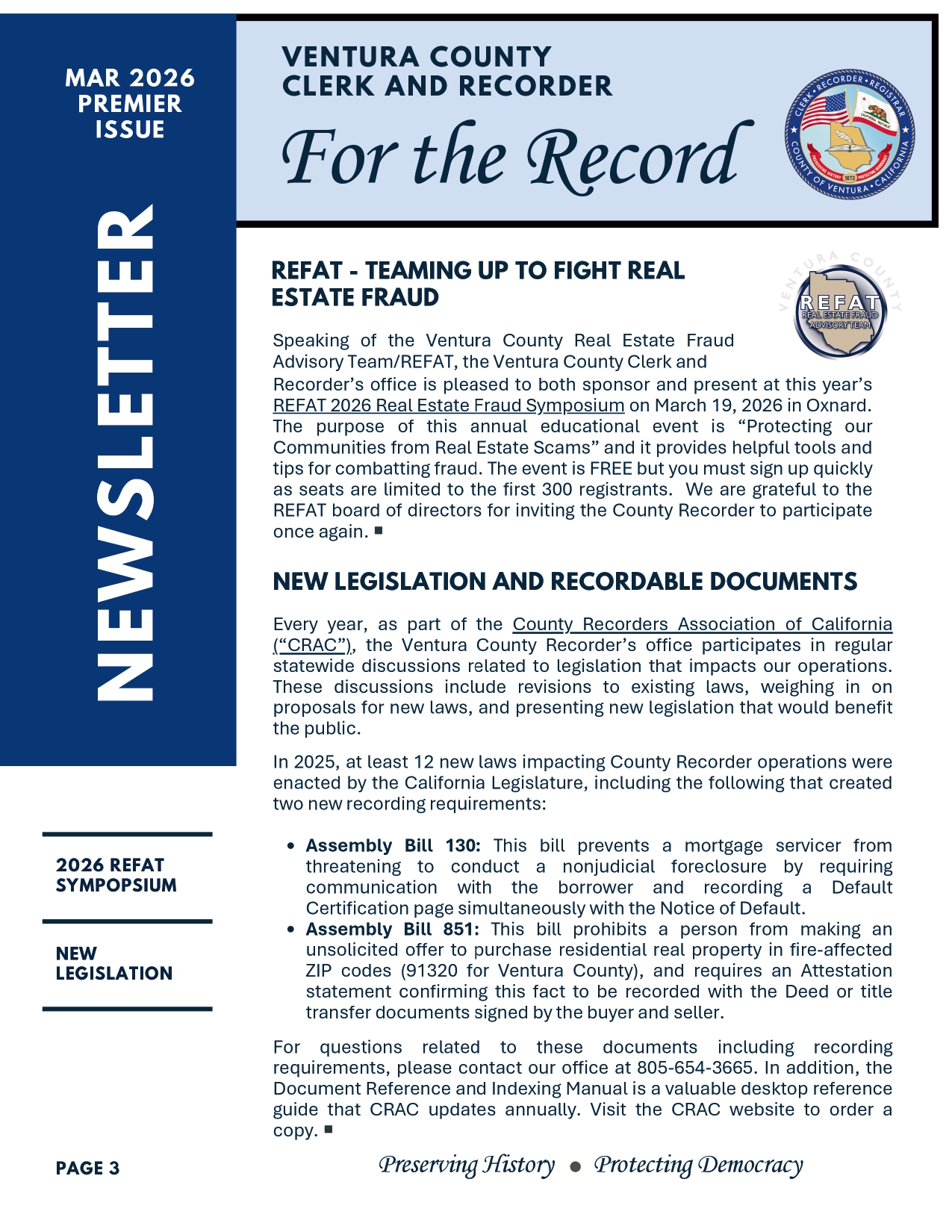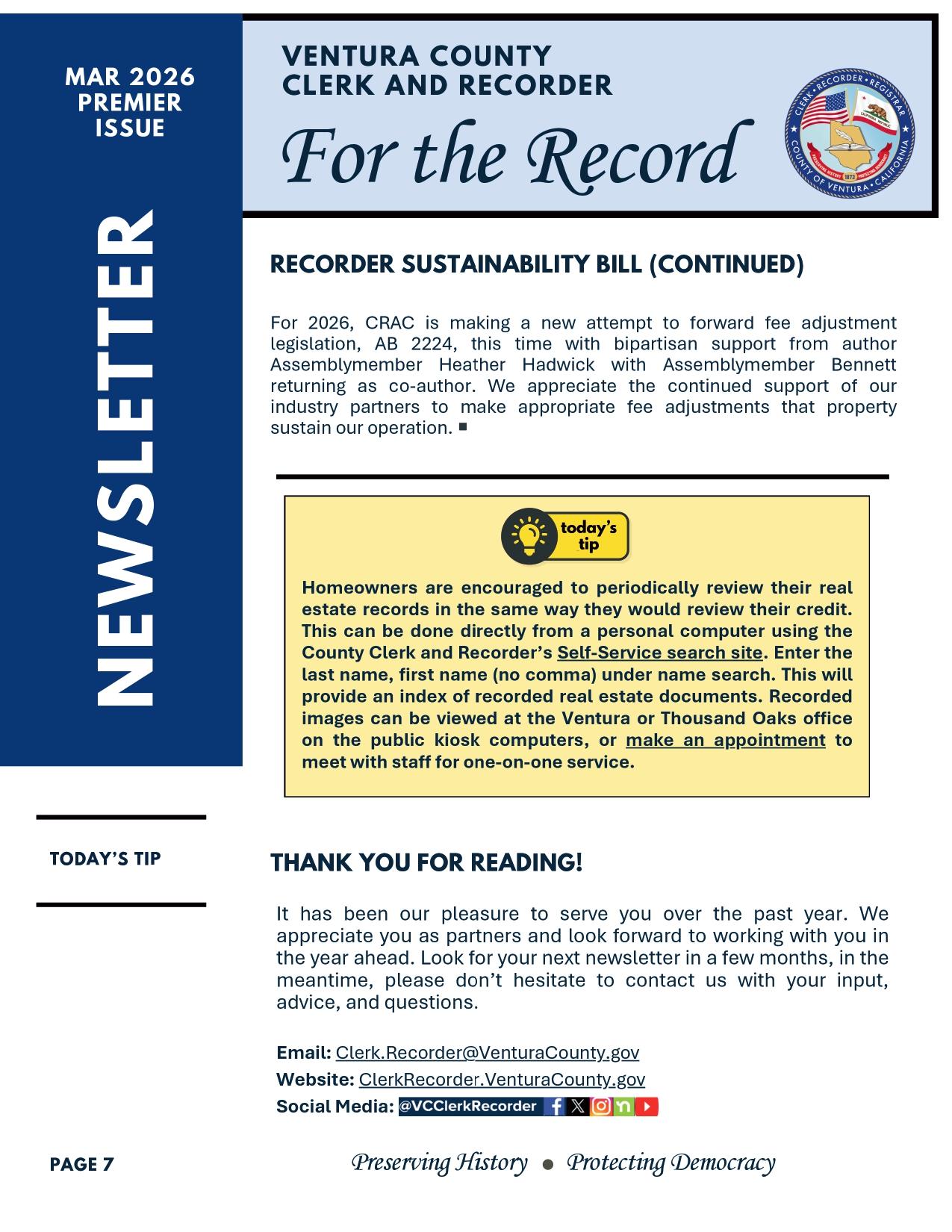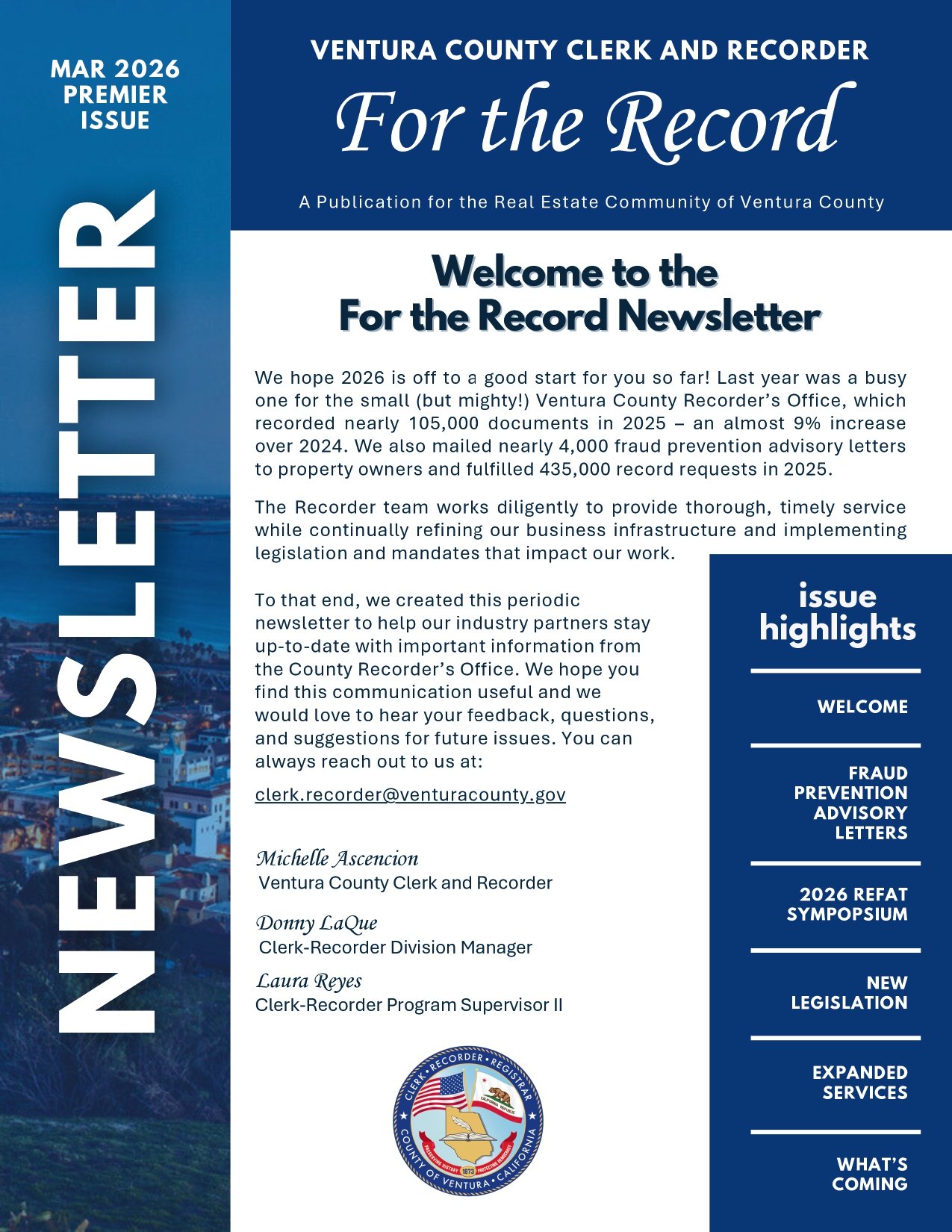 Get your copy of the Venture "For The Record" newsletter! Fraud is always top of mind for any real estate professional. Deeds are also a way to have a scam happen to you. Stay in the know. If you would like to join their newsletter email: clerk-recorder@venturacounty.gov