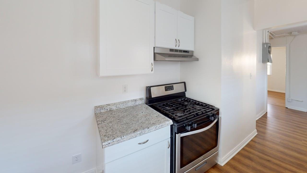 The living room showcases a charming fireplace (non-working) feature, creating a cozy focal point. Large windows in various rooms allow ample natural light, enhancing the sense of space. The kitchen, though compact, is equipped with modern appliances, including a stainless steel gas range and oven. White cabinetry and countertops contribute to a clean, contemporary aesthetic.