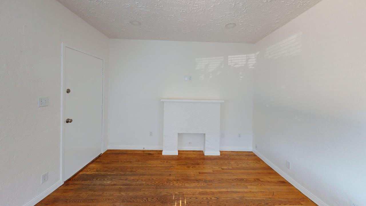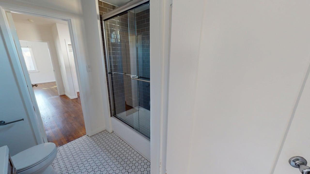 Bedrooms feature built-in closets for storage efficiency. The bathroom boasts a modern design with sleek tiling and a glass-enclosed shower. Throughout the home, textured ceilings add visual interest, while recessed lighting provides even illumination.