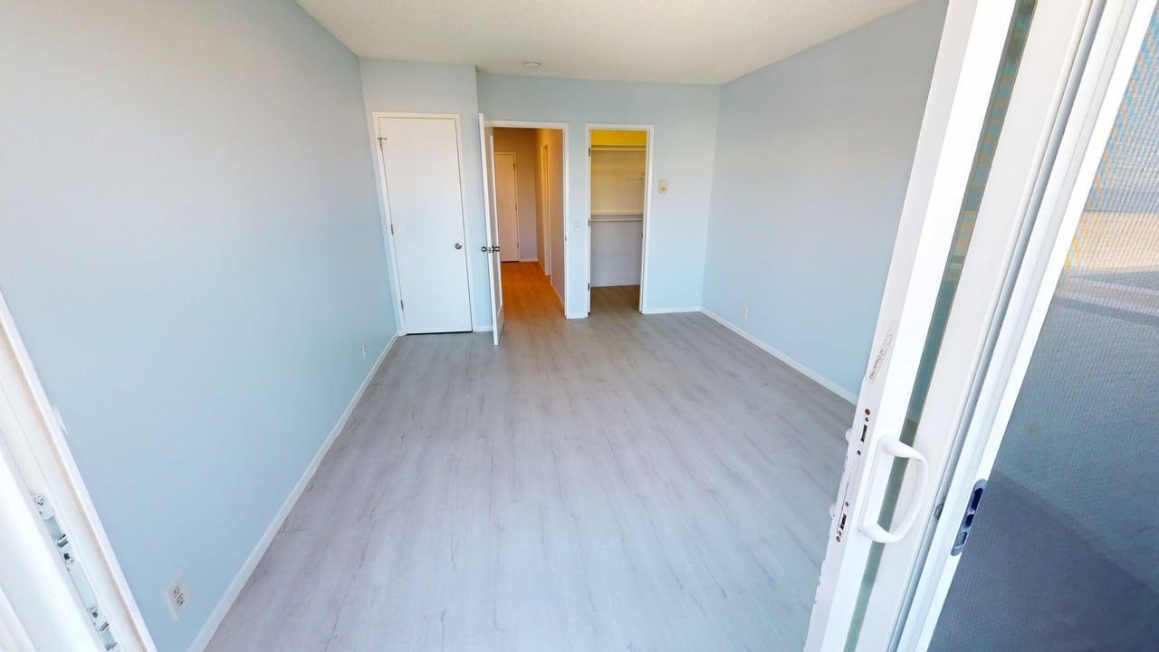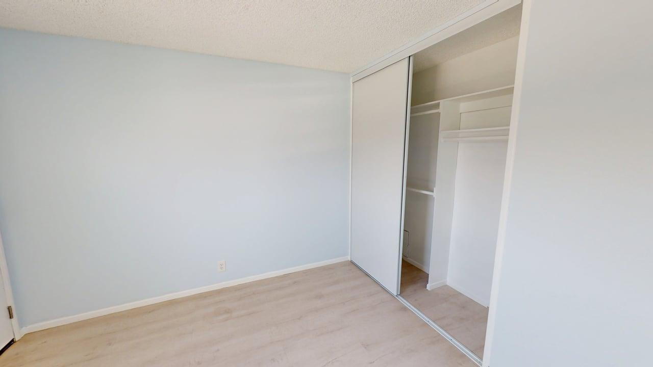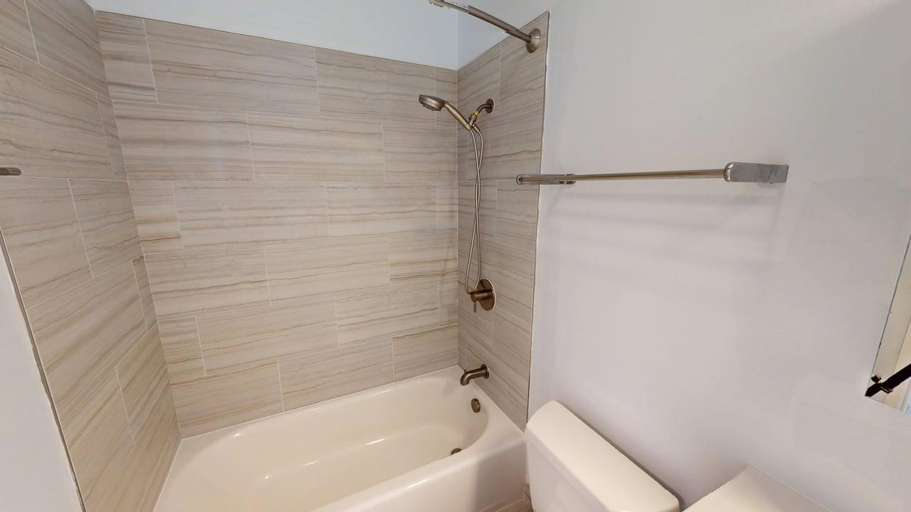 The bathrooms feature contemporary fixtures, including a bathtub with a modern designs and neutral-toned tiling. Built-in closets with mirrored sliding doors maximize storage while visually expanding the room.