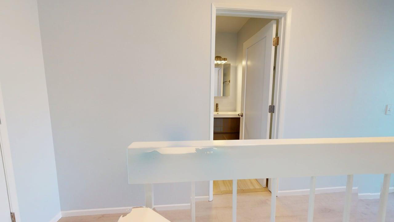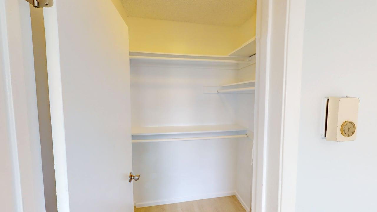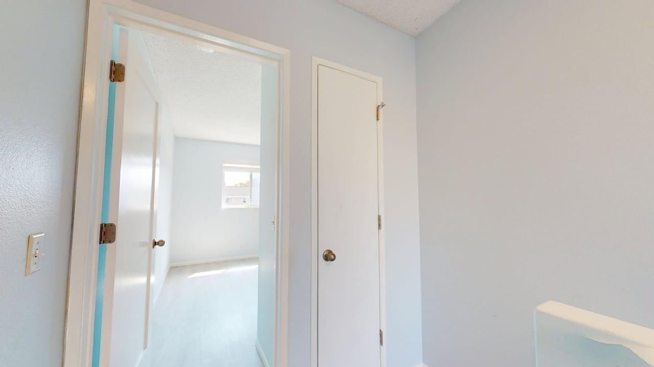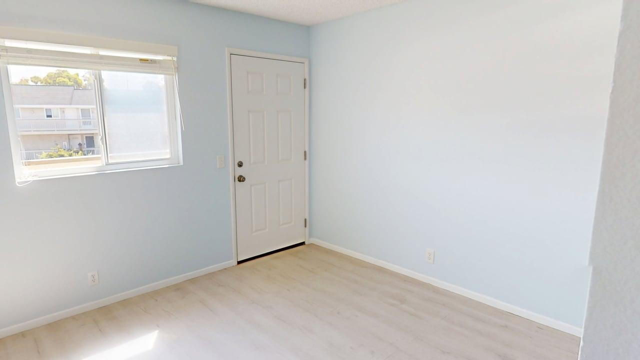 The bathrooms feature contemporary fixtures, including a bathtub with a modern designs and neutral-toned tiling. Built-in closets with mirrored sliding doors maximize storage while visually expanding the room.